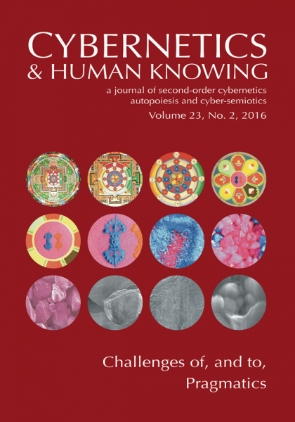 AllVolume 23Issue: 2Year: 2016Table of ContentsForeword: Challenges of, and to, PragmaticsArticles: Why Do We Want To Live In Cybernetics?Three Levels of Semiosis: Three Kinds of KindsCan Pragmatists Believe in Qualia? New Visual Hermeneutics Column: Column on Transdisciplinary RealismBook Review: Helpful Feedback A Reader on Both Cybernetics and Systems Theory Featured Artist: Victoria Vesna