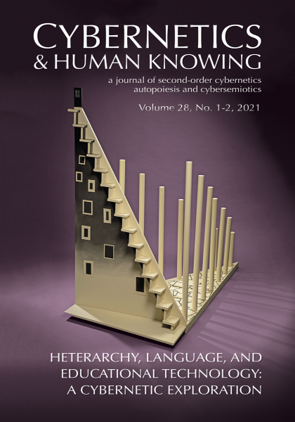 AllVolume 28Issue: 1-2Year: 2021Table of ContentForeword: Heterarchy, Language, and Educational Technology: A Cybernetic ExplorationArticles: The Seven Themes of Heterarchy Reviewing a 75 Year-Old Concept, and Suggestions for further developmentThe Immateriality of InformationOn Being Dimensional: The Fourfold Articulation of an Ongoing EventThe Warrant for Constructivist Practice in Educational TechnologyColumn: Virtual Logic—Reflexive DomainsASC Pages: Reflections on the Design and Practice of a Cybernetic(s) ConferenceBook Review: The Artist in the Machine Some Thoughts Surrounding Human and Machinic CreativitySocial and Material Approaches A Fine Muddle—Parsing Observation Points in Relation to Gaian SystemsFeatured Artist: Carla Rae Johnson