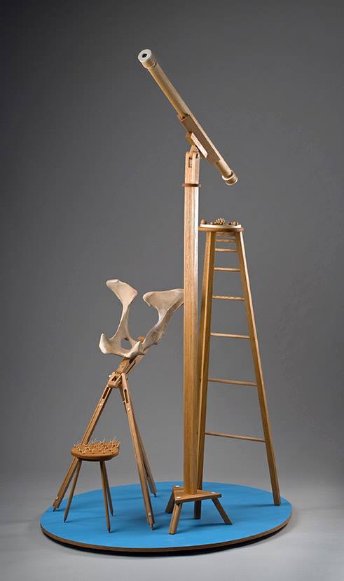 Georgia O’Keeffe (1887-1986) has long been revered by feminist artists as a forerunner, a matriarch, and a role-model for women artists. This, not only because of her serene and powerful paintings, but also because she lived her life creatively and logistically on her own terms. The stark beauty of the New Mexico desert drew her there. I feel Georgia’s vision was one that required a supreme focus, and careful attention to her surroundings, the landscape, and natural forms. In this sculptural tableau, if you look from a particular angle through a hole in the bovine pelvis, you will observe the solid blue of the sky seen in one of her iconic paintings. Her focus, her attention is on the material presence, the beauty and drama of natural forms here on earth. Her choice to live and work in isolation must not have been an easy one, hence the uncomfortable quality of her three-legged stool, which also might evoke the reported prickliness of her personality!