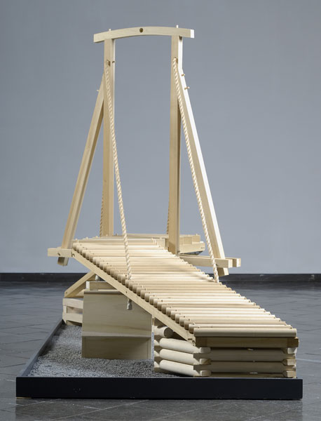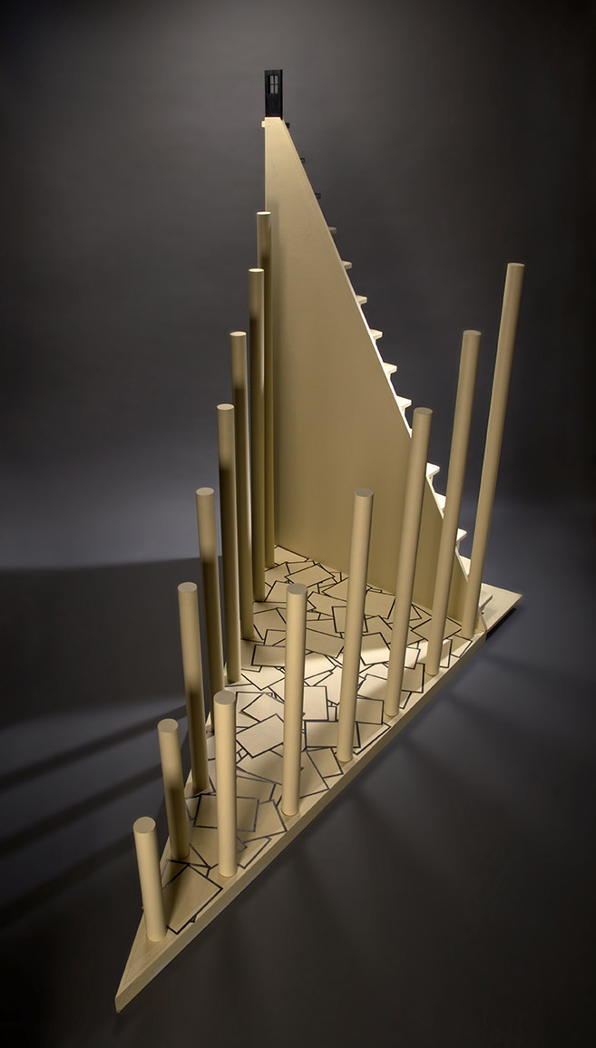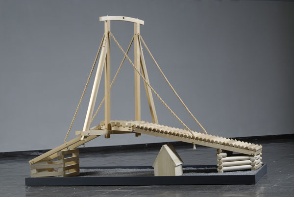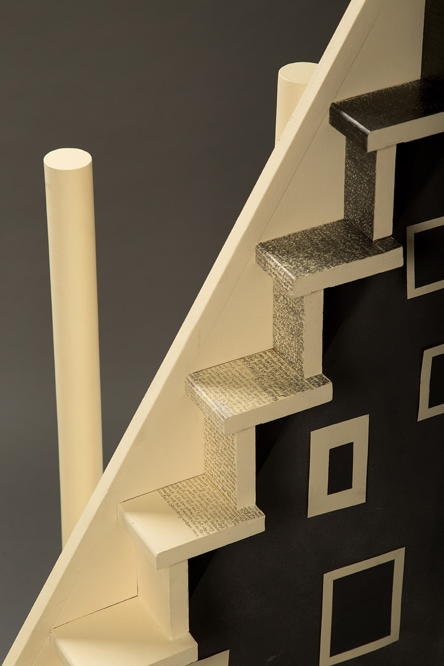 Audre Lorde was a self-proclaimed black, lesbian, feminist, socialist, mother, and warrior poet. A charismatic speaker, Lorde valued honest, self-awareness and speaking truth to power. She questioned the racism, sexism, homophobia, and classism of the social structure, her peers, the black community, the white power structure, and feminist sisters. Lincoln sat in the seat of power. His mythic rise from poverty to presidency was premised upon his position of privilege: white, male, North American, tall, thin, heterosexual privilege. His greatest accomplishment: freeing the slaves, was not a priority. Only when it became part of an overall tactic for success in the preservation of the Union did Lincoln enact the Emancipation Proclamation to free the slaves. In this sculptural tableau, Lorde and Lincoln play “bridge.” This is not a card game, but a physical, symbolic span across an obstacle. A bridge needs to be built between privilege, power, influence, and economic security, on the one side, and those denied the same advantages on the other. It is Lincoln who must build the bridge. It is not a straightforward crossing, but a difficult, jagged one; composed of huge steps up, twists, inclines, and internal tensions. At the top of the center of the crossing is a spirit-level, symbolic of the quest to equalize and create a more level ground. Beneath the bridge sits the master’s house. Symbolic of the existing social structure, it is this structure that must be bridged with understanding and common ground, level ground, so that together Lorde and Lincoln (you and I) can dismantle its walls and work toward a just future.