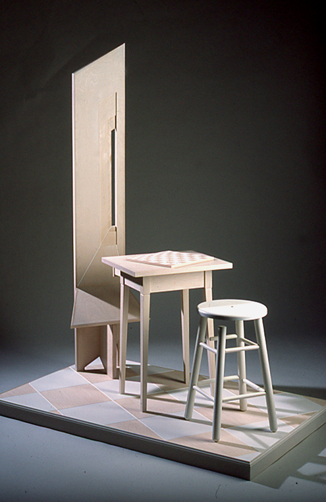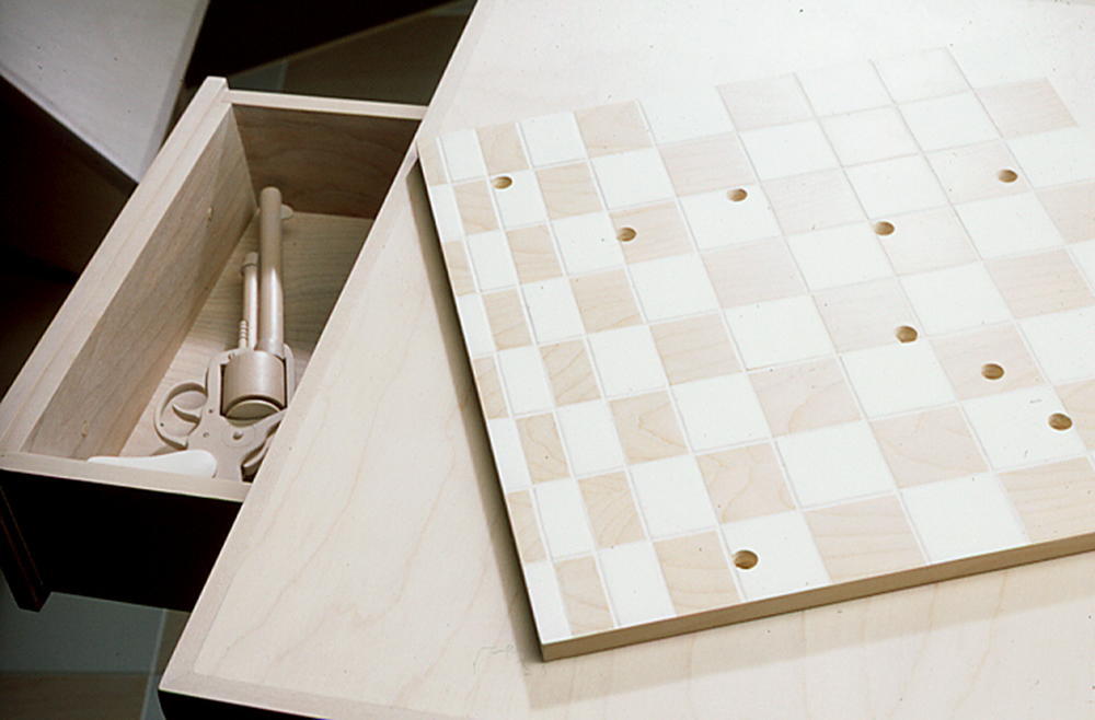 My fantasy, realized in this work, has been to bring these two originals together: a meeting of the minds, a conversation between equals, a challenge to their spirits. Thus, this first portion of The Séance Series features a sculptural tableau referencing an imagined meeting between Emily and Marcel. A good part of the challenge and mischief of such a project lay in the astonishing dissimilarities of these individuals. Two more different personalities and creative styles could not, I think, be envisioned. This sculpture depicts an encounter of two who never met. (Emily Dickinson died in 1886, and Marcel Duchamp was born in 1887.) Because chess became a serious obsession with Duchamp until eventually it seemed to eclipse his making of art, Emily and Marcel sit down to play a game of chess. The only piece is Emily’s loaded gun.