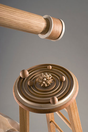 Johnson’s Séance Series expresses heterarchy through poetic and highly elaborated sculptural installations that use visual and verbal metaphorical connections between pairs of notable historical figures who are rarely considered within the same conceptual frame. Wooden sculptures, drawings and writings invite the viewer “to question … language, self-reference, information, and communication” while highlighting social, political, and cultural issues.