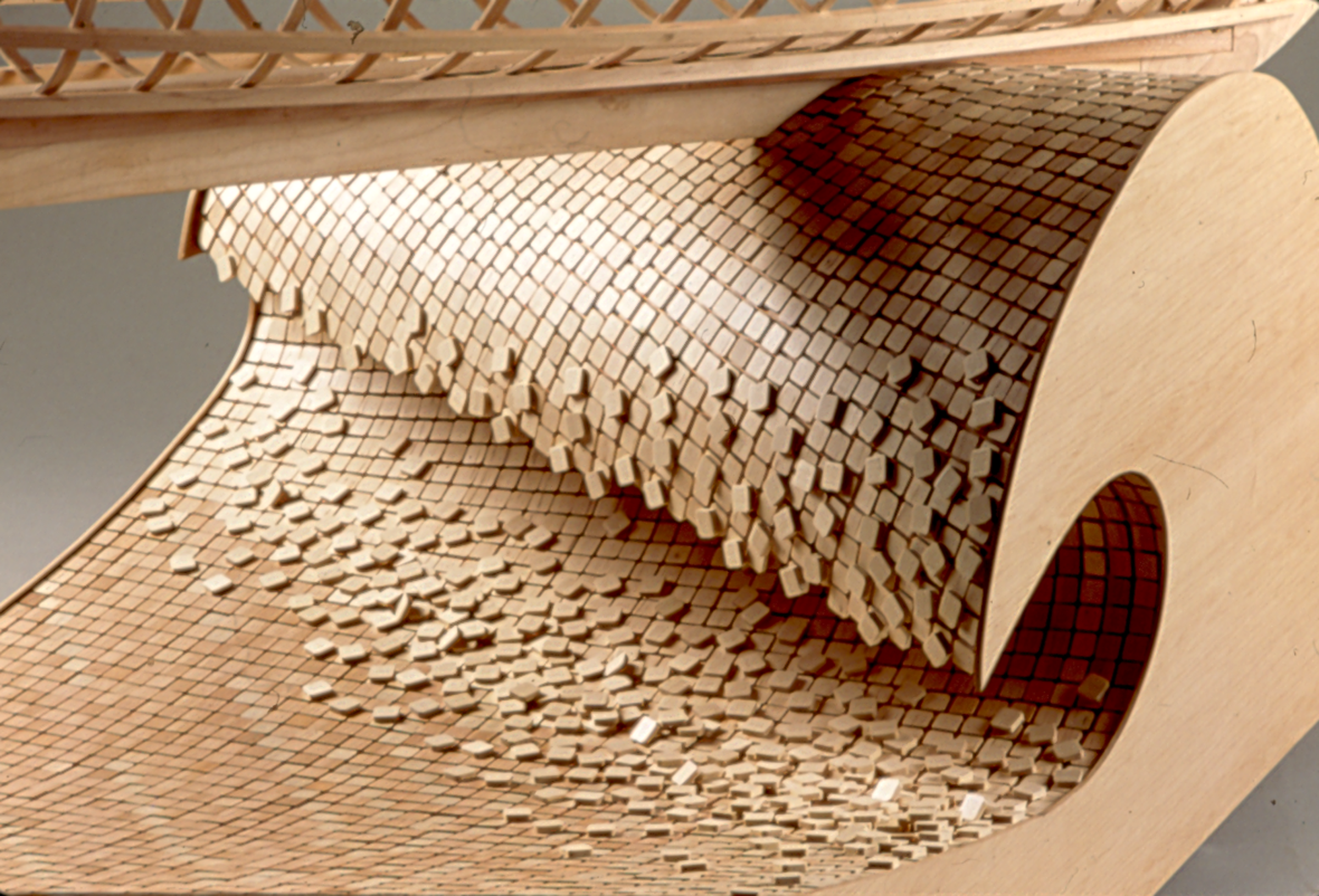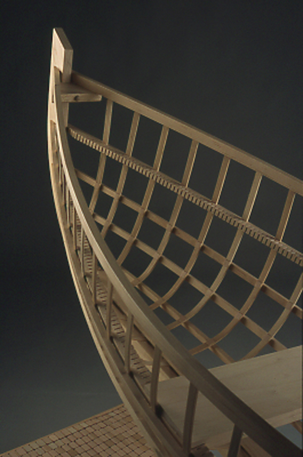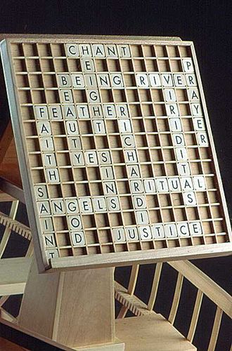 As I contemplated the encounter of Hildegard and Herman I became aware of some deeply significant unifying qualities they shared. Hildegard and Herman each tap into the spiritual reservoir of a collective unconscious to realize profoundly transpersonal revelations. Thus, their work is of deep psychic significance to all humans. They both balance conscious intellect with visionary insights. Their visions emphasize the interrelatedness of all things, above and below and the union of opposites: as in the complex relationships of beauty and terror, good and evil, and light and darkness. Their respective works reveal an unequivocal respect for nature, the creatures of the natural world, and the essential relationship of water to life. Finally, they each identified art as the missing link between science and spirit. The sculpture, Hildegard of Bingen Meets Herman Melville depicts the skeletal form of a small boat in which Hildegard and Herman play two separate word games (game boards are positioned on each side of a medieval lectern). They ride on a wave of lettertiles from which they form words consistent with their individual visions. Symbolic of the infinite creative possibilities realized by both Hildegard and Herman, the sea of letters also suggest the sense of immensity and cosmic wholeness we find so compelling in their works.